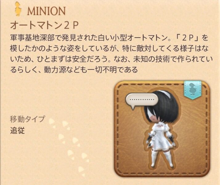 FF14のミニオン「オートマトン2P」は、パッチ5.3で追加された24人アライアンスレイドダンジョン「人形タチノ軍事基地」の、最後のBOSS討伐後に現れる宝箱から入手できるミニオンです。