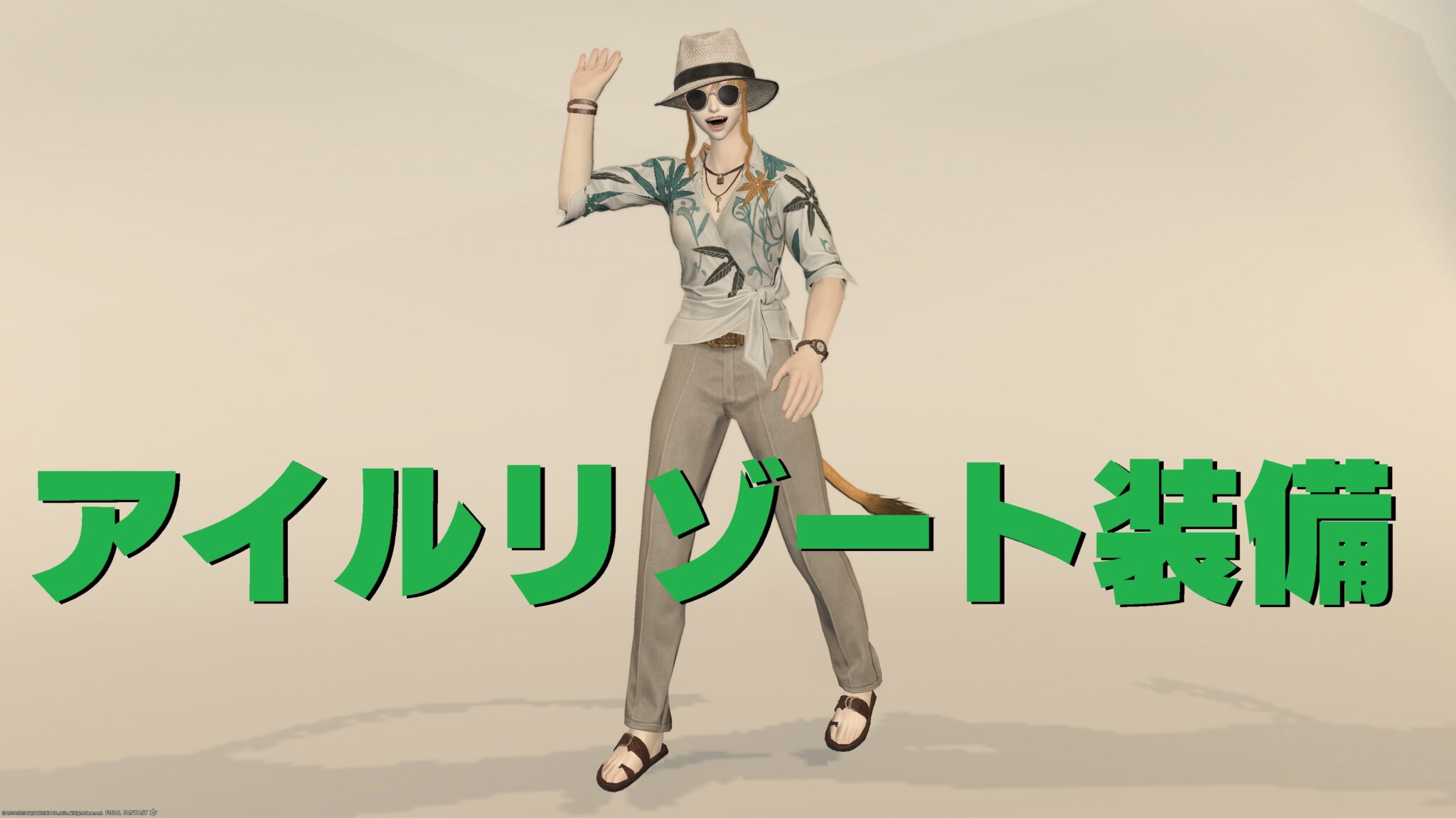 ミコッテ女性が着衣したアイルリゾート装備です。