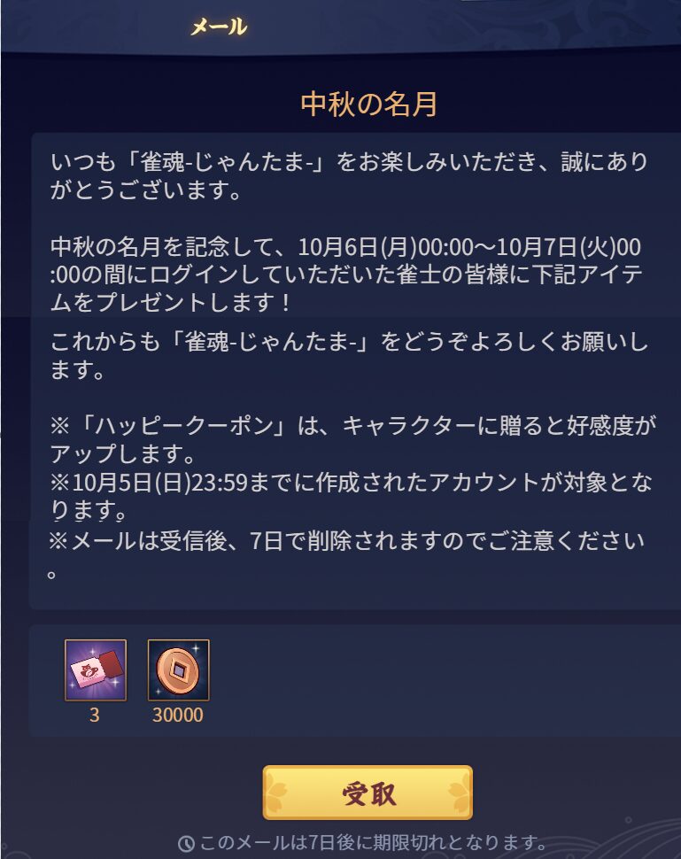 そうそう、10月6日(月)00:00~10月7日(火)00:00 の間にログインした雀士にプレゼントしてくれるから絶対忘れたくないやつ✨️