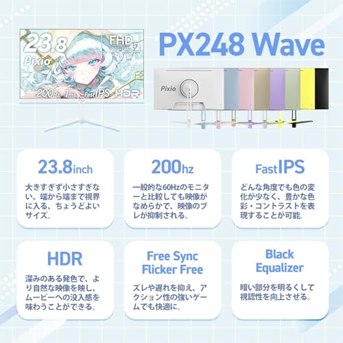 - Pixio PX248 Wave Whiteは、ホワイトやパステルカラーなどカラーラインナップを取りそろえ、理想のゲーム部屋のコーディネートができるゲーミングモニターです。通常のゲーミングモニターから一段上の200Hzという高リフレッシュレートと発色の良いIPSパネル備えた、ゲーマーのために作られたスペックも持ち合わせています。