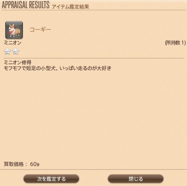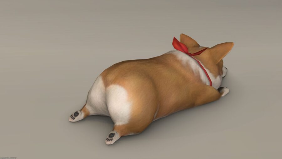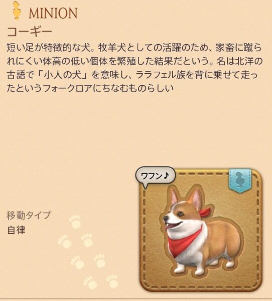短い足が特徴的な犬。牧羊犬としての活躍のため、家畜に蹴られにくい体高の低い個体を繁殖した結果だという。名は北洋の古語で「小人の犬」を意味し、ララフェル族を背に乗せて走ったというフォークロアにちなむものらしい
