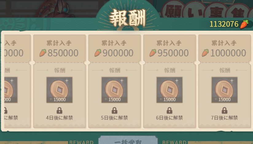 累計入手の報酬は一部“◯日後に解禁”の時間開放が残るので、クリア後も受け取り忘れに注意です〜