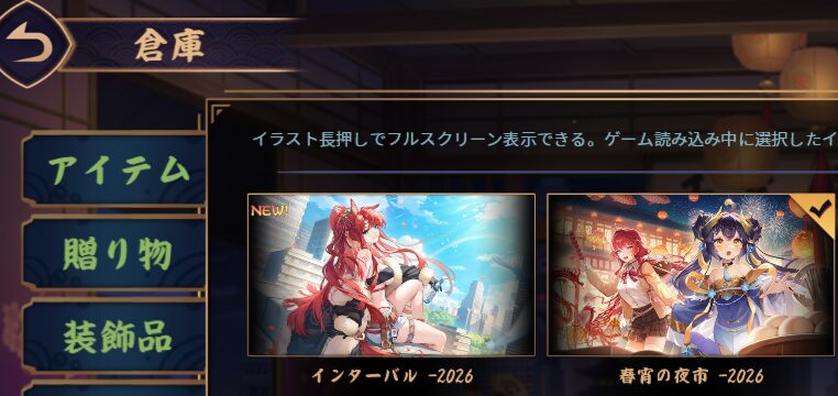 倉庫内にイベント枠が出ていて、たとえばこんな感じのイラストが並びます(NEW表示つきのことも)。