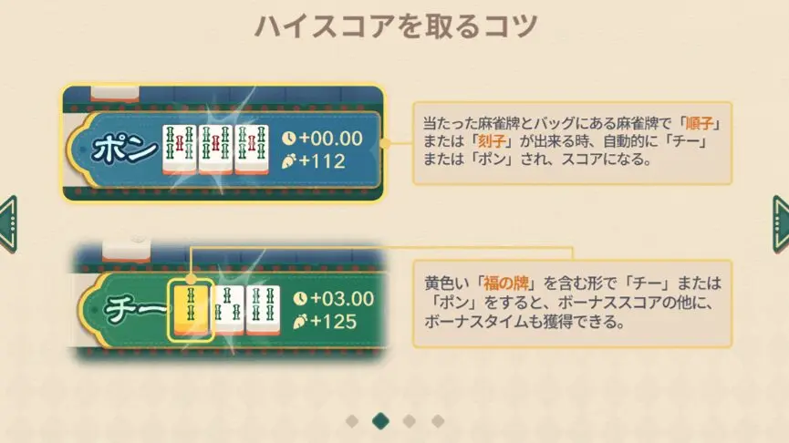 • 当たった麻雀牌とバッグにある麻雀牌で「順子」または「刻子」が出来る時、自動的に「チー」または「ポン」され、スコアになる