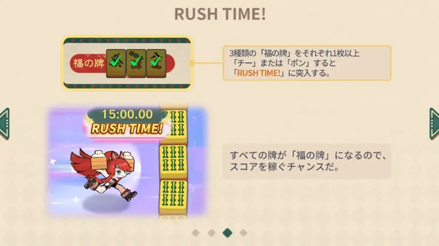 • 3種類の「福の牌」を1枚ずつ含む形チー/ポン すると 「RUSH TIME!」 に突入