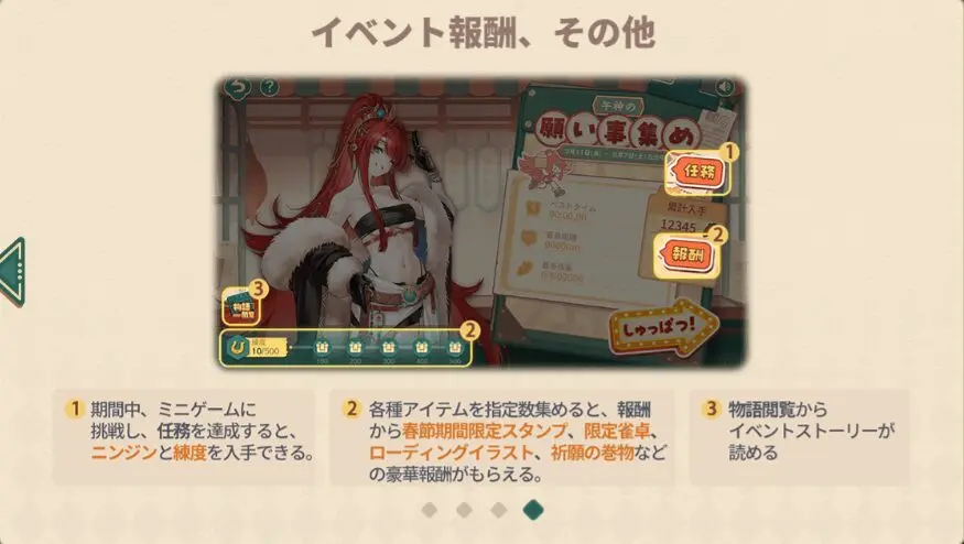 • 各種アイテムを指定数集めると、報酬から春節期間限定スタンプ、限定雀卓、ローディングイラスト、祈願の巻物などが取得可能