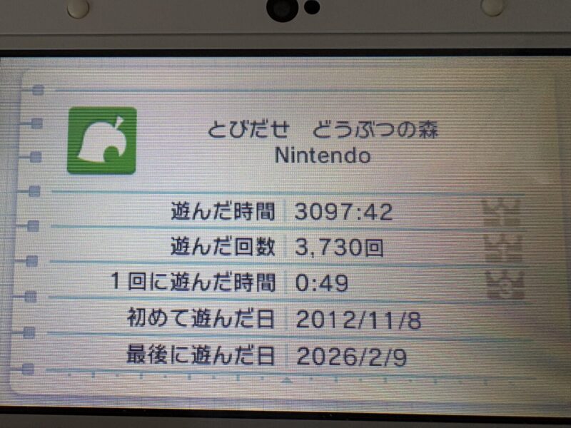 13年という長い期間には、無料でamiibo+というアップデートがあったり、スマートフォンアプリ「どうぶつの森ポケットキャンプ」がリリース、Switch用ソフト「あつまれどうぶつの森」が発売されたり、途中で本体を3DSLLに更新したり、と嬉しいこと、楽しいこともありましたが、始まりがあれば終わりもある。一昨年、本作のオンラインプレイサービスが終了してしまいました。