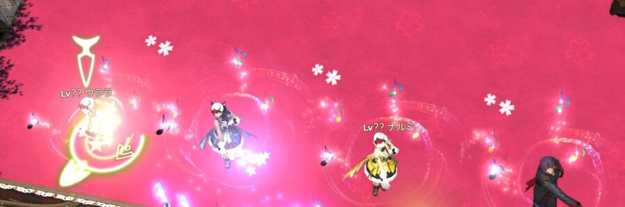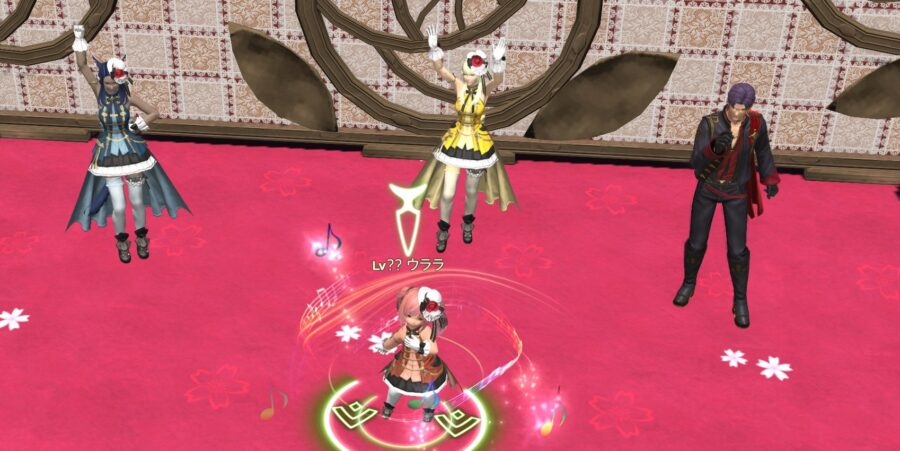 ステージ上で音符のエフェクトが出ているNPCをターゲットして、対応した色の「声援」アクションを使うことで評価に貢献できます。