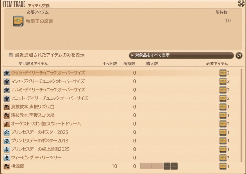 • アイテム交換: 桃源郷FF14アイコン桜吹雪FF14アイコン以外のアイテム(過去分含む)を各1つずつ揃える場合には、証書が計18枚必要。ハウジング勢は周回を頑張りましょう