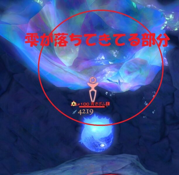 雫(水滴)が落ちてきているような光った岩のあるあたりで、青きボムを自爆させると――。