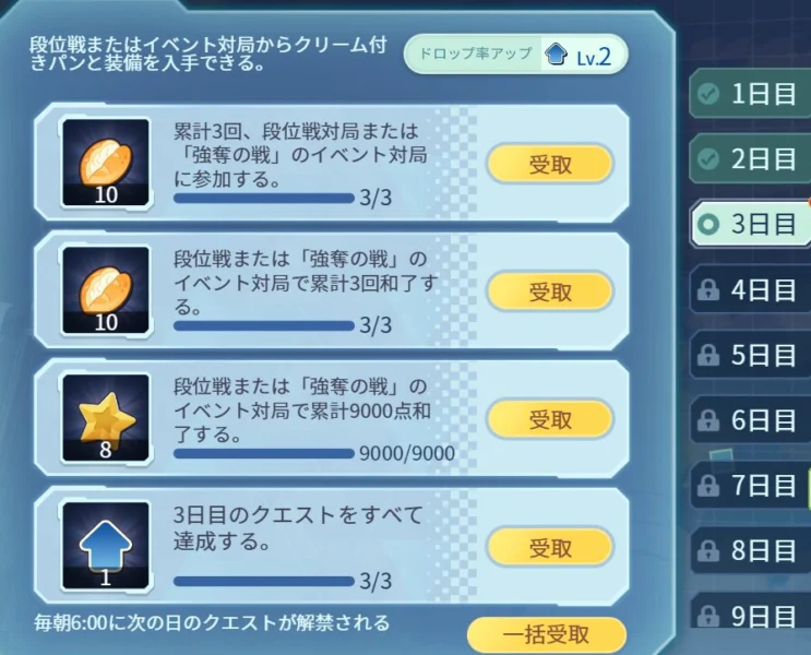 毎朝6:00に次の日のクエストが解禁されるため、イベント期間中はこまめにクエスト画面を確認しておくと進めやすくなります。