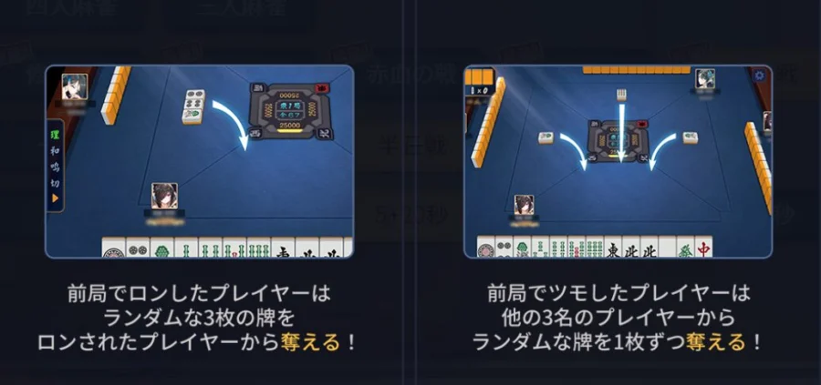 前局でツモったプレイヤーは、他の3名のプレイヤーからランダムな牌を1枚ずつ奪えます。
