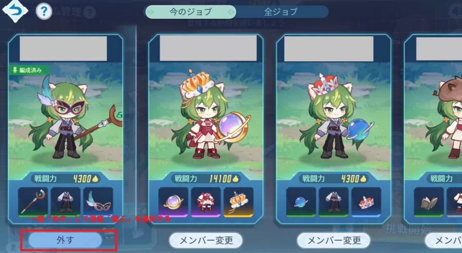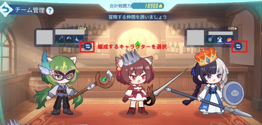 ・チーム管理画面で、対象キャラクターの「変更(矢印アイコン)」を選択