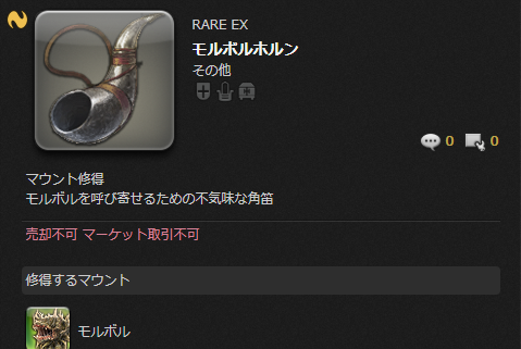 マウント FF14 モルボルマウント 豪傑の青魔道士 モルボルホルンモルボルホルン 取得方法アチーブメント「豪傑の青魔道士」報酬うさちゃん 「大迷宮を極めし青魔道士」「機工城を極めし青魔道士」を達成する。 大迷宮バハムートと機工城アレキサンダー踏破で入手... マウント