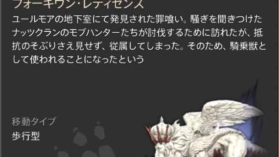 マウント FF14 マウント フォーギヴン・レティセンス マウント うさちゃんマウント、フォーギヴン・レティセンスを入手しました!入手方法:漆黒エリア モブハント戦利品交換品うさちゃんレティセンスホルンはモブハントの戦利品3,200と交換です(^_-)-☆交換場所 ク... マウント極