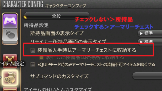 初心者 FF14 装備品入手時に「アーマリーチェスト」ではなく「所持品」入れる設定【初心者さん】 ねこちゃんねこは、うさちゃんから先月教えてもらいました……。もっと早く知りたかったよ……。装備品入手時「所持品」へ入れる設定うさちゃんIDや、交換で得た装備品。これが自動的に「アーマリーチェスト」へ入... 初心者