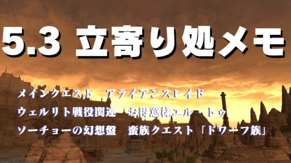 メインクエスト FF14 パッチ5.3 立寄り処メモ 以下、イベントなどのスクリーンショットをいくつか掲載しています。SSのネタバレ要素は少ないほうだとは思いますが、どうかご注意してご覧くださいませ。また、戦闘ジョブレベル80、クラフターレベル80のキャ... メインクエスト