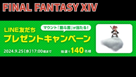 その他 FF14 マウント「筋斗雲」が当たる LINE友だちプレゼントキャンペーン実施 マウント「筋斗雲」が当たる!?うさちゃんファイナルファンタジーXIVのLINE公式アカウントを友だちに追加して、キャンペーンに参加しましょう~😀2024年9月11日(水)~期間限定でLINEのトーク画... その他